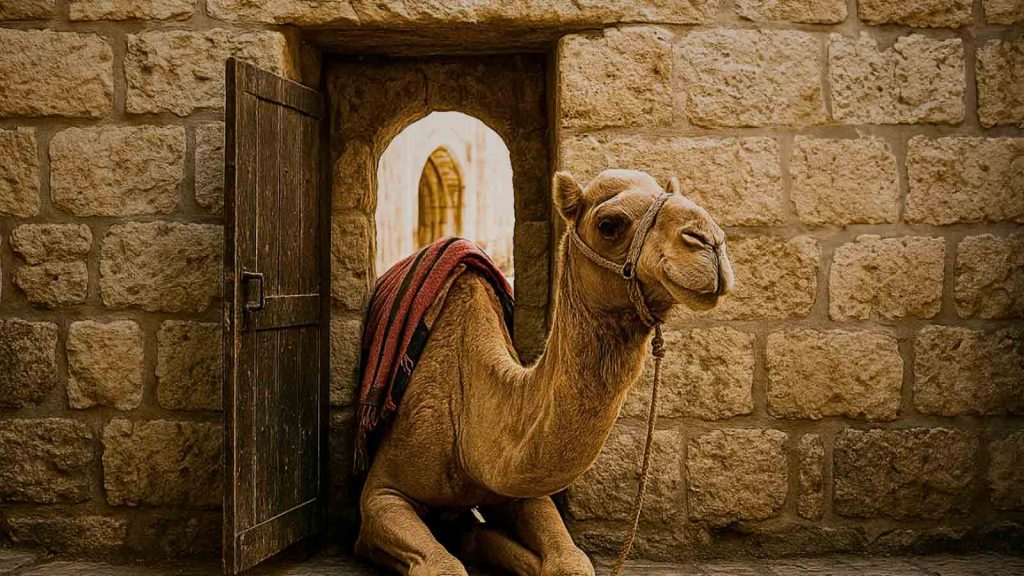 Para suavizar las palabras de Jesús sobre la riqueza, se popularizó la idea de que existía en Jerusalén una pequeña puerta llamada “ojo de la aguja”, por la que los camellos solo podían pasar agachados y descargados. El mensaje sería entonces que los ricos pueden entrar al Reino, pero con esfuerzo y humildad.